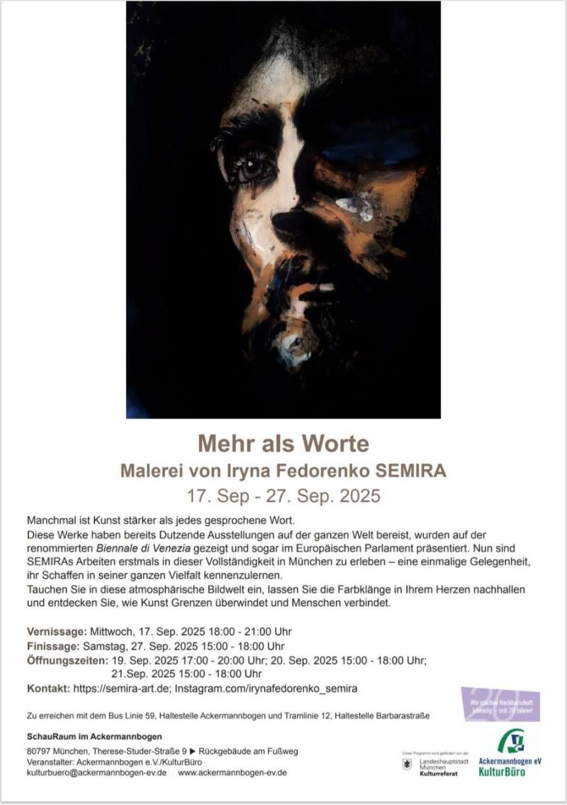 Іноді мистецтво сильніше за будь-яке вимовлене слово. Серією «Більше, ніж слова» українська художниця Ірина Федоренко SEMIRA запрошує публіку у подорож крізь почуття та спогади. Її картини розповідають про втрату й біль, але також про надію, впевненість і мужність почати знову – мужність жінки, яка втекла від війни в Україні та вже три роки живе в Мюнхені.
